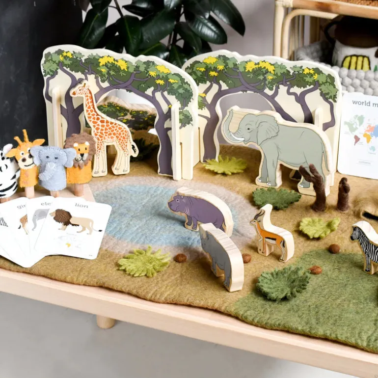 These beautiful Large Safari playscapes are a unique small world playmat that are designed to reflect the colours of the Serengeti landscape in Africa. Beautiful vast grasslands, a cave and a water hole for the safari animals to gather as a water source.