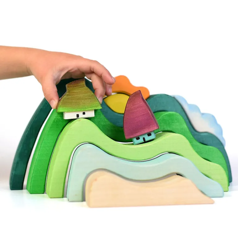 The pieces can have multiple uses individually but as a set they create a beautiful sunset scene that can be completed with the addition of any the wooden houses from our Bumbu Toys collection.