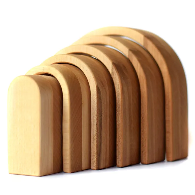 When you hold the pieces of these arches in your hand, you will not only feel the warmth of the maple wood but you will also see the lines from the tree it was made from, perfectly preserved and with no two toys ever being exactly the same. The confirmation of quality and naturalness. The finish is smooth and soft but grippy enough for easy stacking.