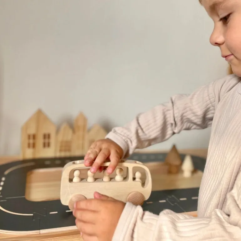 These wooden buses can be used with the WoodyWay roads OR the wheel track also fits the width of wooden train tracks, so it can also be driven on a train track as well!