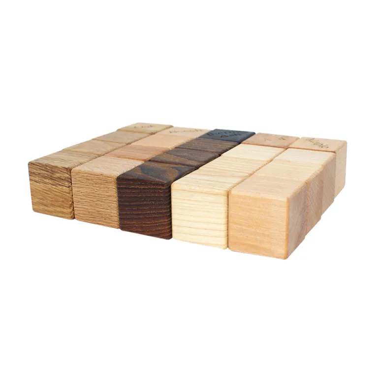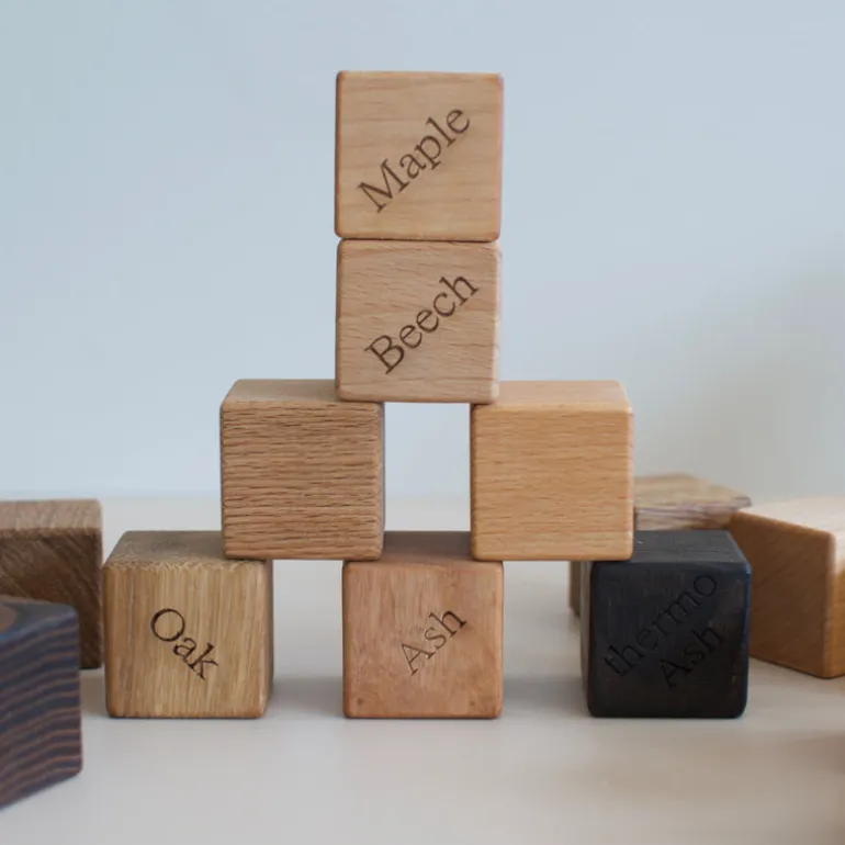 Set includes: 20 wooden blocks measuring 4×4 cm made from Maple wood, Beech wood, Oak, Ash and Thermo Ash.