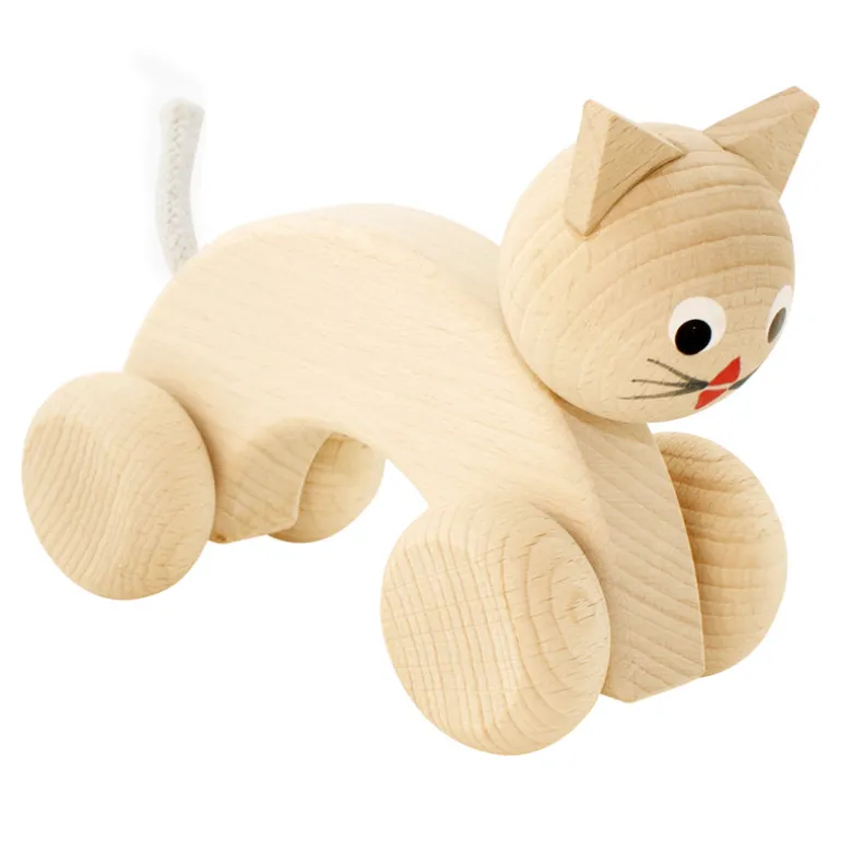 As you can see, our little push along Kitty loves to play! She is perfect for developing their grasping skills and teaching them about movement. They’ll love the feel and smell of the raw wood which is FSC certified and can also be painted so they can get as creative as they like! Handmade in Czech Republic by Miva Vacov.