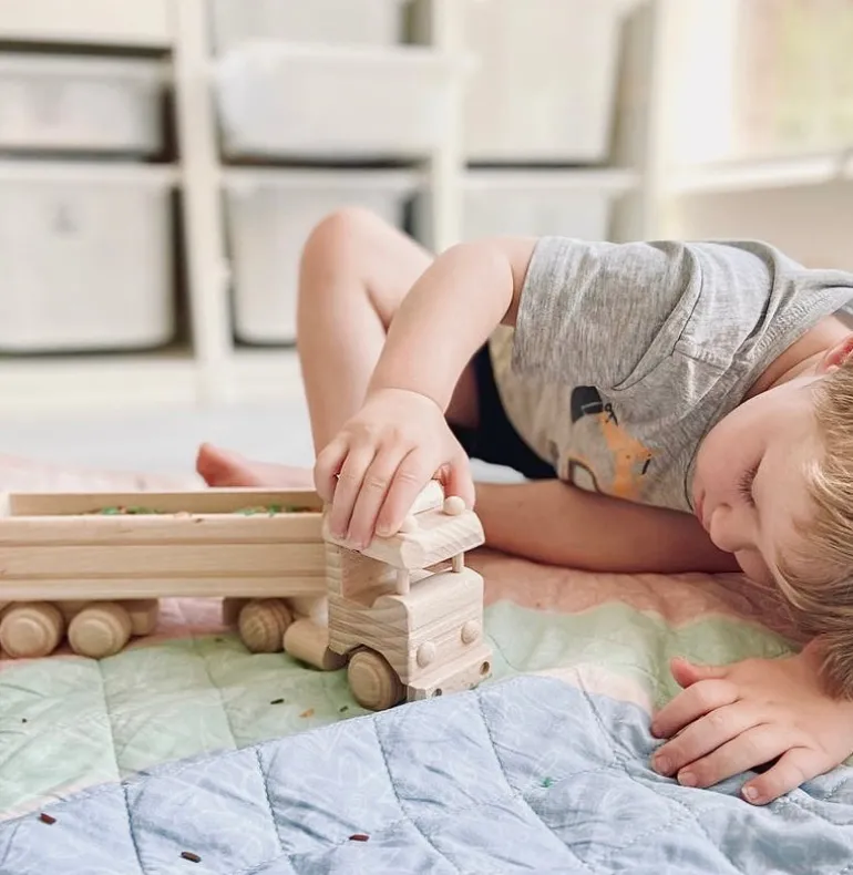 Our Indiana wooden semi trailer toy truck is another awesome addition to our growing collection of handmade wooden toy trucks. She features a decent sized tray so they can have hours of fun loading and unloading all of their other favourite toys.