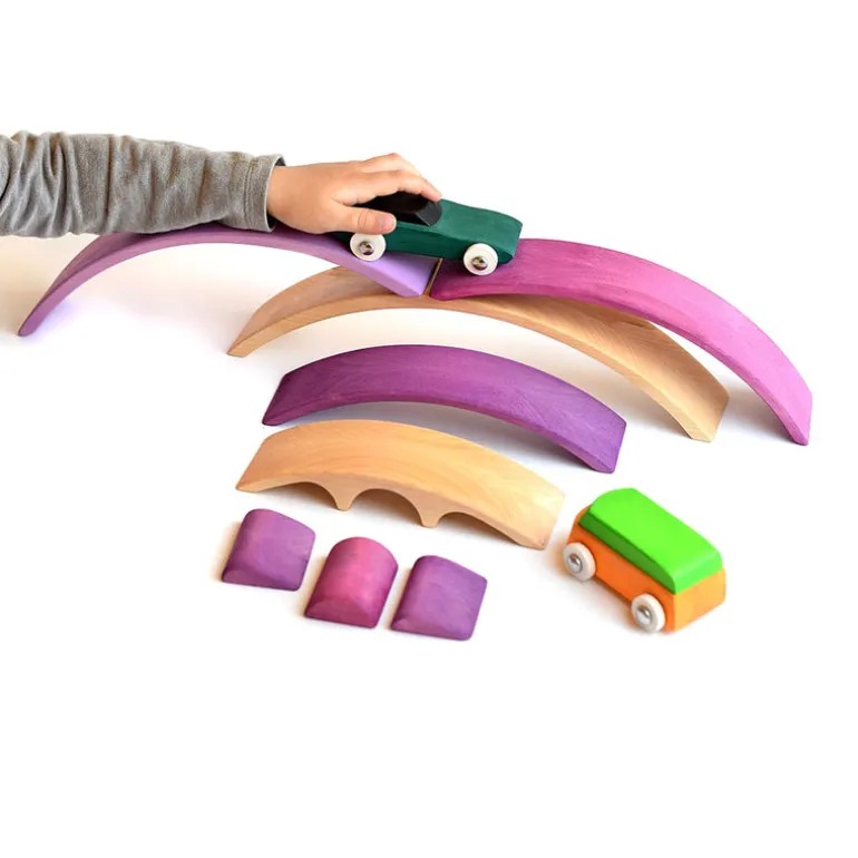 The smaller pieces can be used to cover the grooves between successive bridges and the arches can be stacked and balanced, thus initiating balance games.