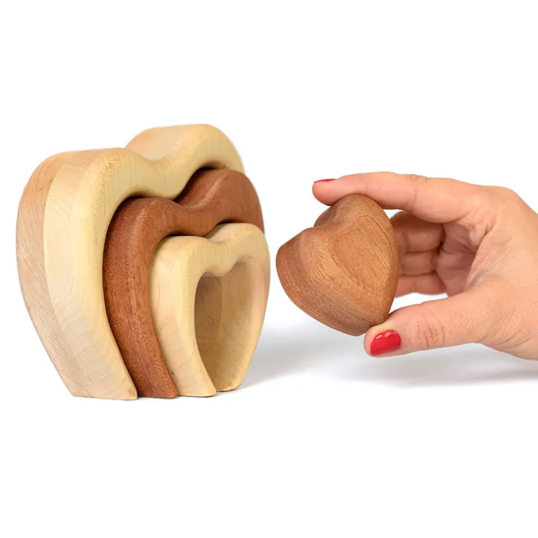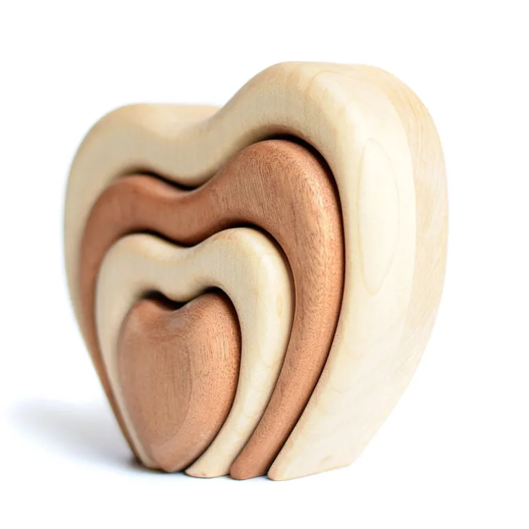 These very special and unique wooden heart stackers are beautifully handmade from the finest maple and mahogany wood. Maple wood is incredibly strong, and has a beautiful colour and finish. Wood workers gravitate towards maple for its light, creamy colour, smooth grain pattern, and impressive durability. Mahogany has been synonymous with luxury since English furniture makers made it their wood of choice in the late 1700s and it was regularly referred to as ‘the wood of kings’. Mahogany also resists wood rot and it has excellent workability, and is very durable.
