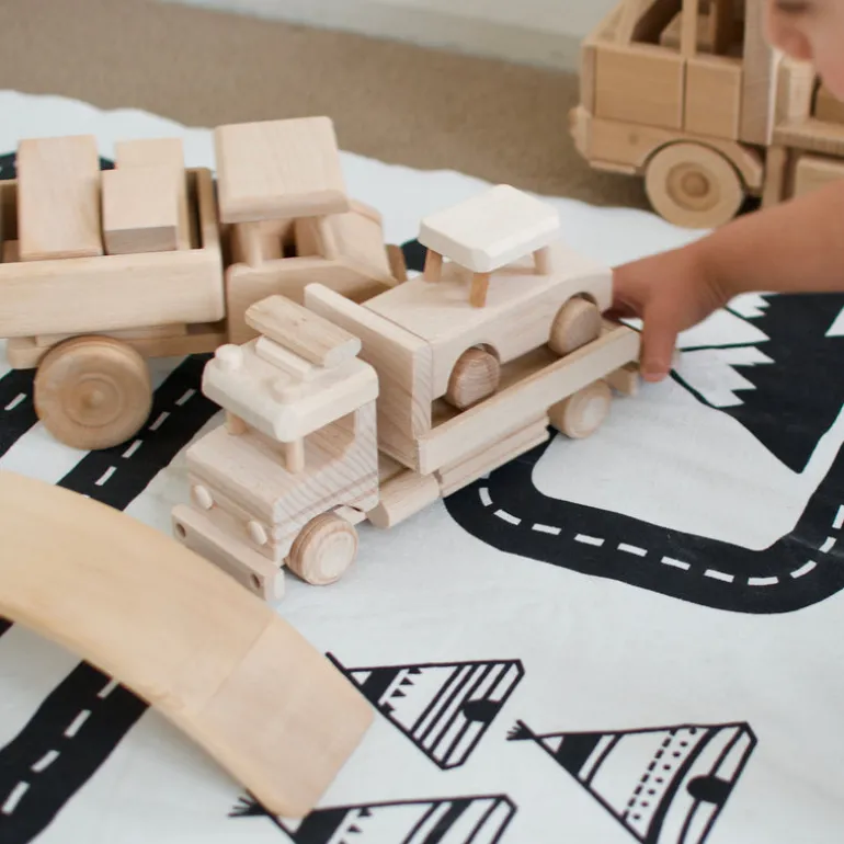 When it comes to fun, our Jackson truck definitely will not disappoint! This beautiful toy wooden tow truck features fully functional wheels, large trailer with ramp and a small wooden car for added playtime entertainment!