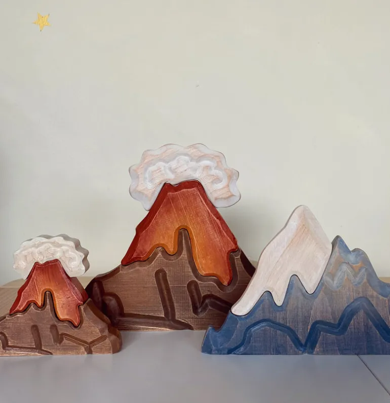 These amazing wooden volcano’s are a wonderful addition to their collection and create the perfect backdrop for any small world set up. The lava and smoke pieces fit in like a puzzle piece allowing for even more creative play opportunities. Add some wooden dinosaur figures to create a magical world for your child to learn about and explore.