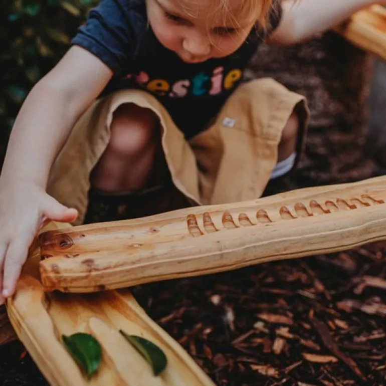 Children can construct their own wooden watercourses and then watch the water cascade down these rustic wooden channels as they pour the water down a handcrafted wooden funnel.