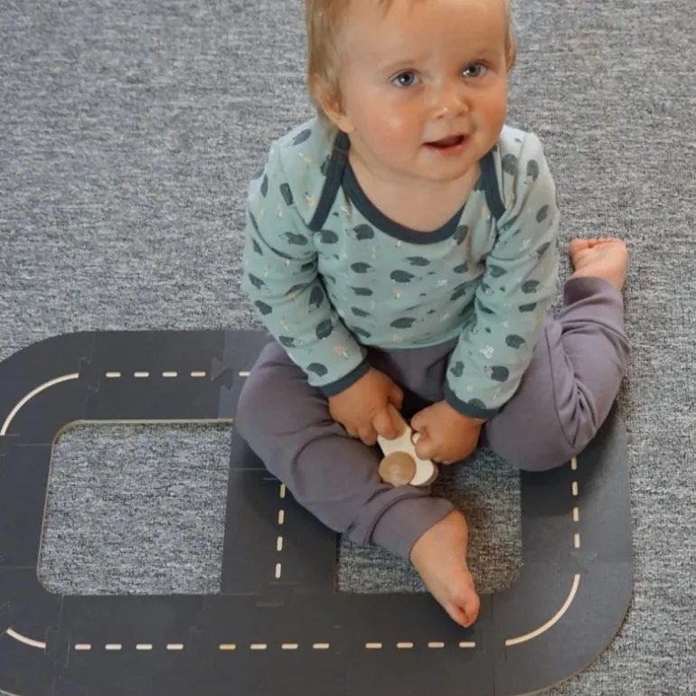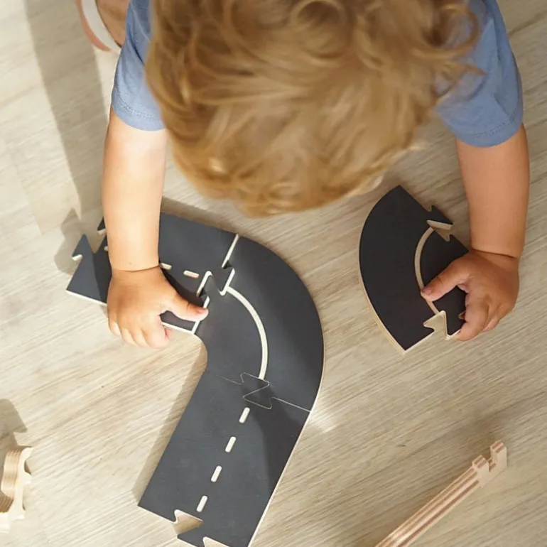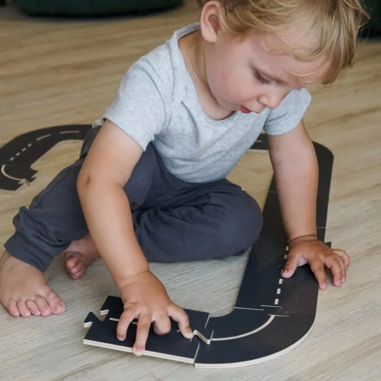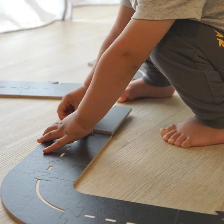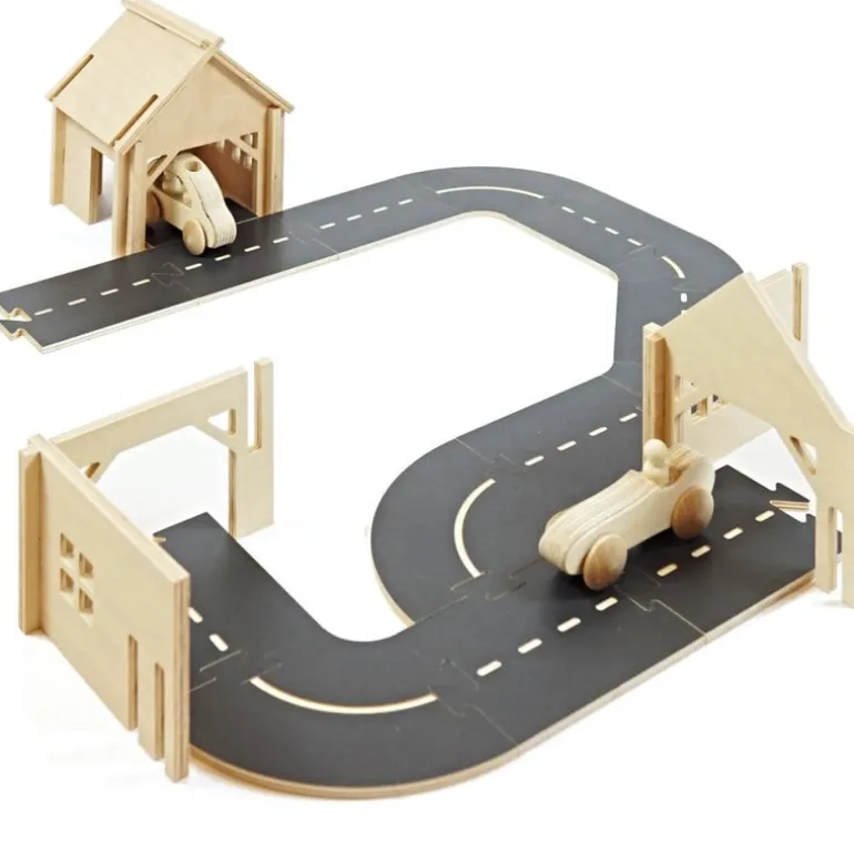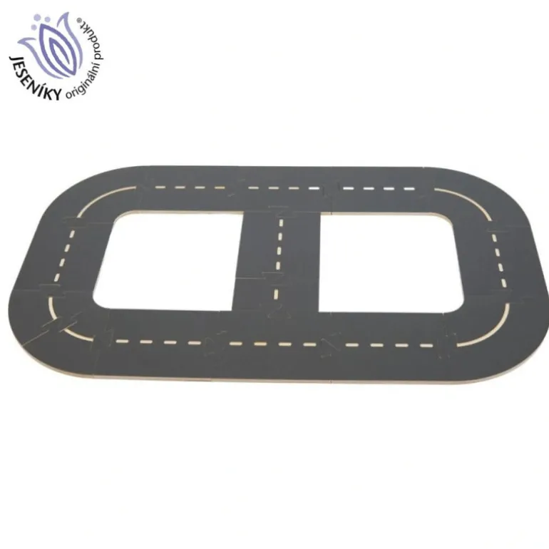 The WoodyWay wooden road kit is a variable car track made of birch wood. It fits perfectly with the Domeczech house and town sets, but children can also use it separately with the toys and cars they already have at home.