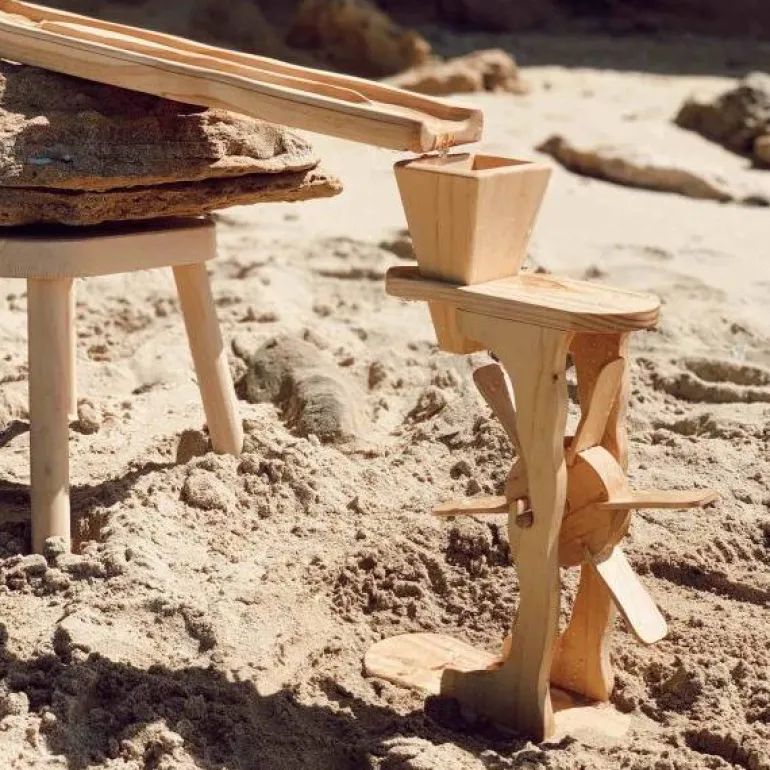 The funnel at the top can be removed so children can experiment with pouring other loose grains and explore what causes the wheel to spin. Place the Wooden Wheel can in a small stream between two sticks and it will keep spinning as the water rushes by!