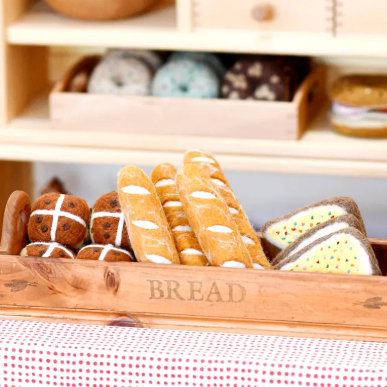 This set includes 2 baguettes (different lengths). Each baguette has been meticulously needle-felted with dense wool that has been dyed with non-toxic colours, making it safe for play.