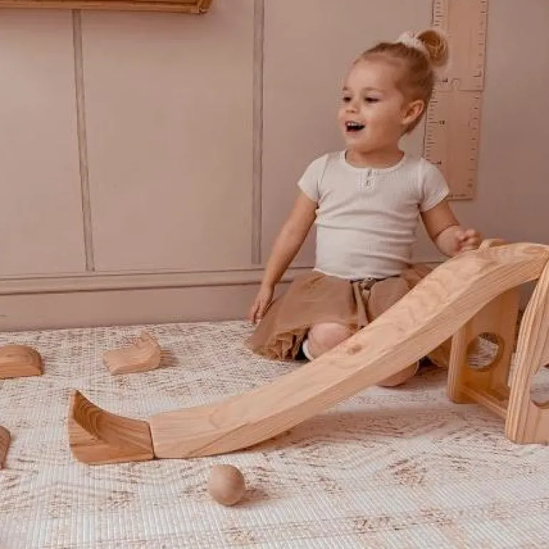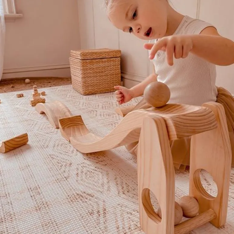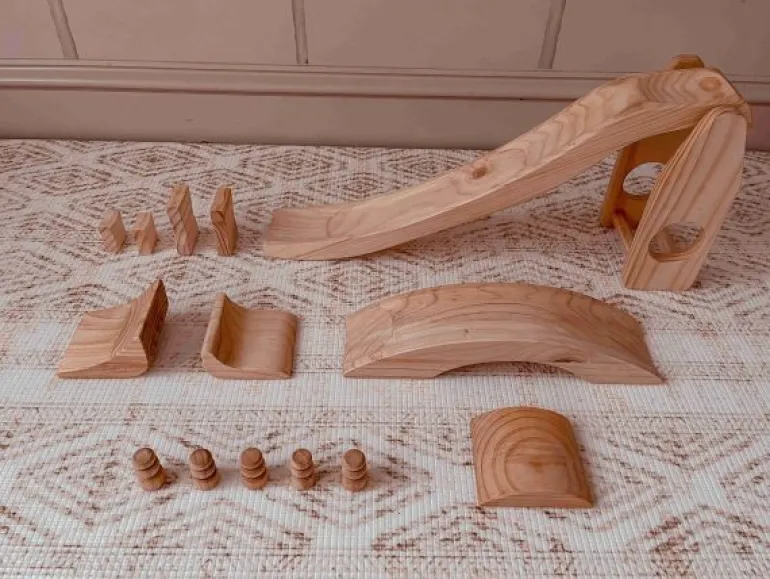 It’s time to take ball runs to a whole new level of fun! This unique wooden ball run has a variety of wooden pieces for children to design their own ball runs. Send the balls flying in the air over wooden jumps or bridges and knock down the wooden figurines or dominos. Can be also used with marbles, cars and wooden balls.