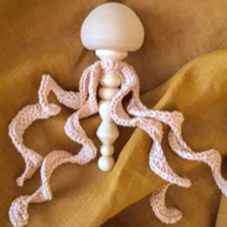 They combine different textures and natural materials of cotton yarn and solid wood. The carved handle and curly ‘tentacles’ encourage exploration and enhance motor skills.