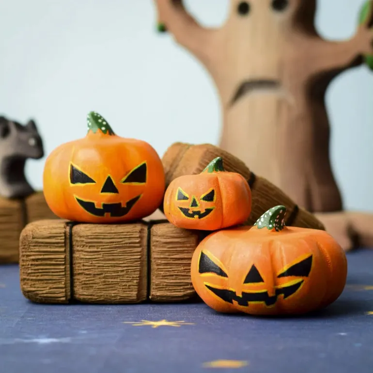 Each pumpkin is carved from sustainably sourced wood and painted with non-toxic, child-safe colours, making them perfect for safe and imaginative play.