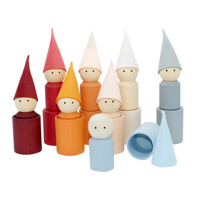 Each set comes with 8 coloured peg dolls with their own matching coloured felt hat and 8 colour matching cups.
