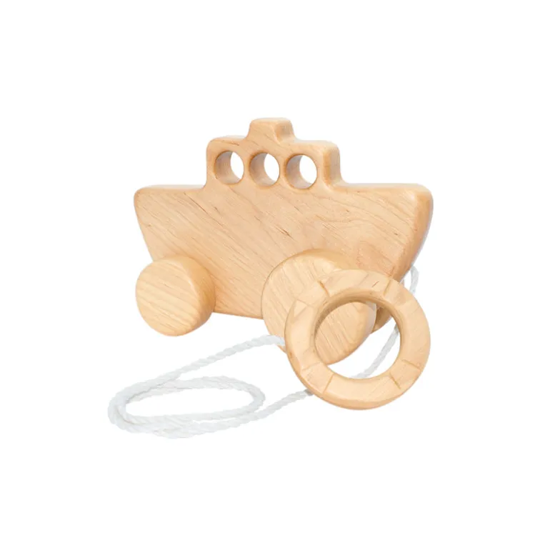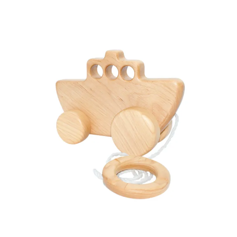 They feature a large wooden ring at the end of the string to make it easier to hold and pull as well as finger holes on the toy so they can also hold and push them along. As the boat moves along, the differing wheels allow it to gently bob up and down just as it would on the open seas.