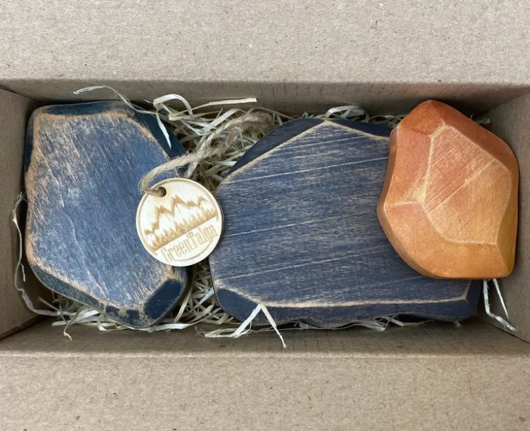 Each set comes with 3 rocks, varying in size and is neatly packed in a сraft box filled with wood shavings and each toy comes with picture card.