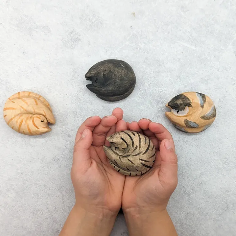 These sleepy wooden cat knows how to enjoy the good life. She may be resting now but it won’t be long before she wakes again for some playful fun!