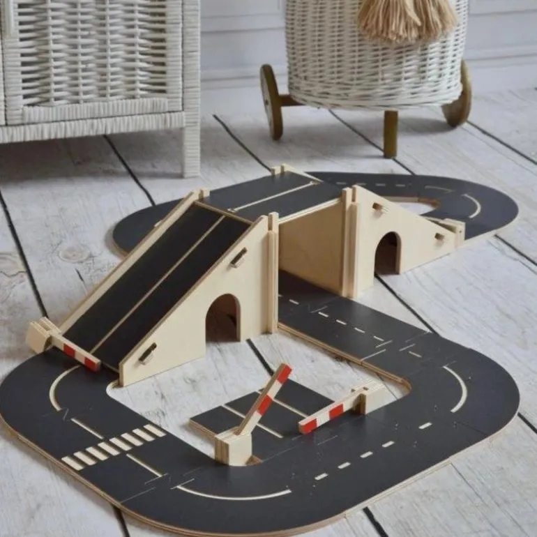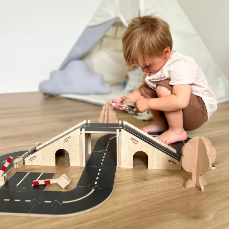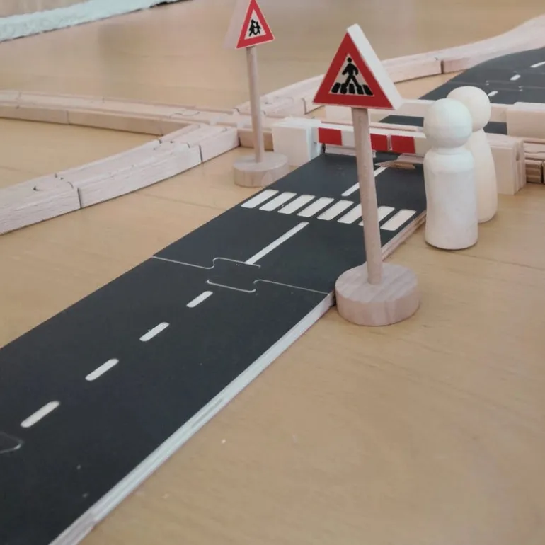 The WoodyWay wooden road kit is a variable car track made of birch wood. It fits perfectly with the Domeczech houses, but children can also use it separately with the toys and cars they already have at home.